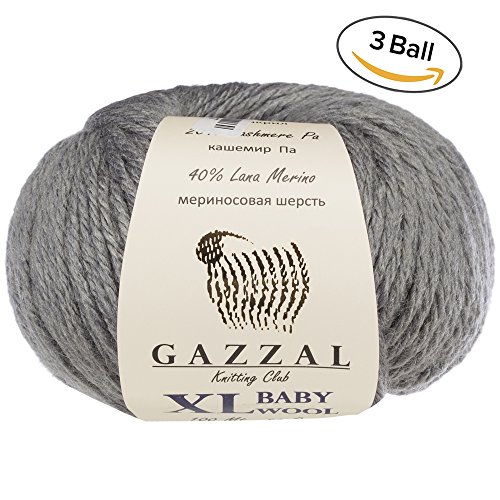 3 Pack (Ball) Gazzal Baby Wool XL Total 5.28 Oz / 328 Yrds, Each Ball 1.76 Oz (50g) / 109 Yrds (100m) Super Soft, Medium-Worsted Yarn, 40% Lana Merino 20% Cashmere Type Polyamide, Grey-818