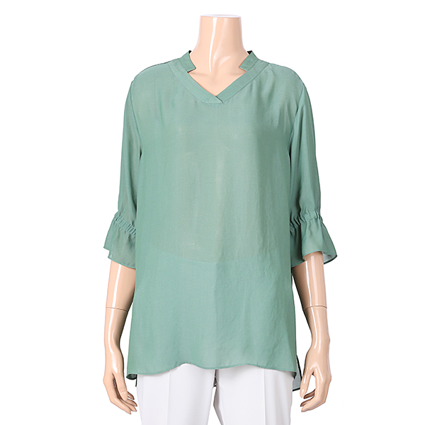 이 제품은 V넥의 Y존칼라와 목선의 단아함과 7부기장의소매의 편안함과 소매통의 주름셔링의 벌륜소매로