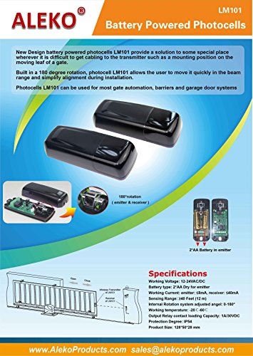 -. Feature : Compatible with all ALEKO gate openers (swing and slide) / Battery type: 2 AA batteries, working voltage: 12-24V DC/AC / Internal rotation system adjusted angel: 0-180 degree / Can also be used with garage doors, alert systems, alarms / Sensing range: 40 ft. (12m)