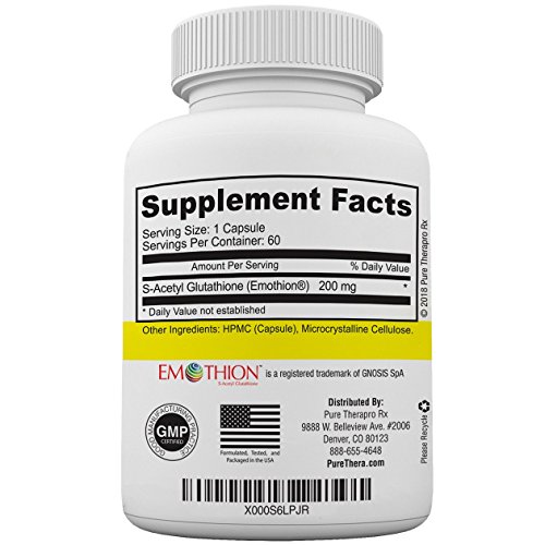 EACH CAPSULE Contains 200mg of S-Acetyl-Glutathione - 60 caps is a 2 month supply! Use of enteric coating further protects stability. Free of Magnesium Stearate! Manufactured in the USA in a GMP-certified facility, for guaranteed quality and potency.
