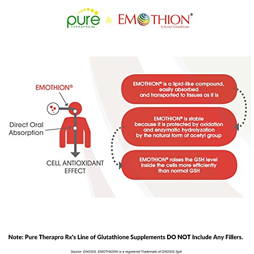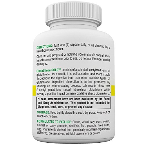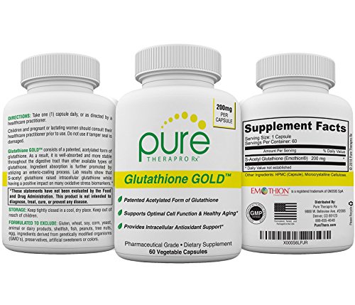Glutathione GOLD is a patented acetylated form of glutathione. This form is well-absorbed and more stable throughout the digestive tract than other forms on the market. Use of enteric coating further protects stability. Laboratory data showed that Glutathione GOLD increased intracellular glutathione and had a positive effect on many oxidative stress biomarkers.* ✔ Efficient Once a Day Dosage. Each Capsule Contains 200mg of S-Acetyl-Glutathione. 60 caps is a 2 month supply. ✔ We use a a patented S Acetyl Glutathione from a top European Biotech. Studied head to head against IV glutathione with very similar results. ✔ Use of enteric coating further protects stability. Made with non-GMO Ingredients. Mechanism of Absorption S-acetylglutathione, a lipid-like compound, is taken up intact by chylomicrons in the gut. The acetyl bond is placed on its thiol group or sulfur group, which prevents oxidation and allows the molecule to pass diffusively into the cell after absorption in the gut. The bond is then cleaved by non-specific enzymes inside the cell. Acetylation prevents the breakdown of glutathione, and S-acetylglutathione does not require energy expenditure to be cleaved to reduced glutathione once it crosses the cell wall.* All Pure Therapro Rx Formulas Meet or Exceed cGMP Quality Standards. This product is manufactured in the United States in a GMP-certified facility.Feature
