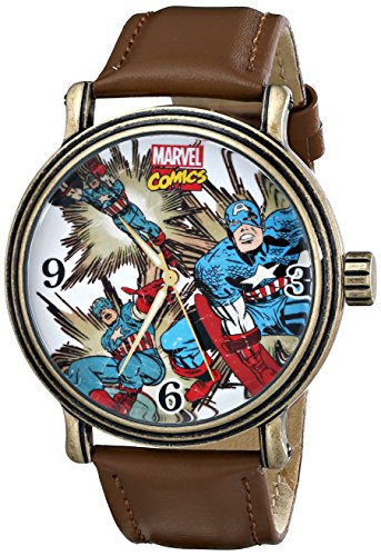 Item model number: W001759 Batteries: 1 Nonstandard Battery batteries required. (included) Date first listed on Amazon: October 10, 2014 Brand, Seller, or Collection Name:Marvel Model number:W001759 Part Number:W001759 Item Shape:Round Dial window material type:Mineral Display Type:Analog Clasp:Buckle Case material:Metal Case diameter:43 millimeters Case Thickness:10 millimeters Band Material:Synthetic leather Band length:8.8 inches Band width:22 millimeters Band Color:Brown Dial color:White Bezel material:Metal Bezel function:Unidirectional Item weight:1.12 Ounces Movement:Analog quartz Water resistant depth:99 Feet