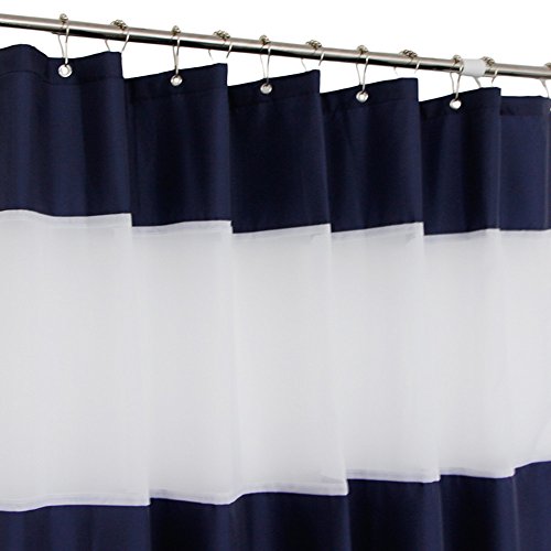 Eforcurtain Modern Striped White Organza Shower Curtains Waterproof Mildew Resistant, Solid Navy Blue Fabric Bathroom Curtain Sets for Men and Women, 72 x 78 Inches X long