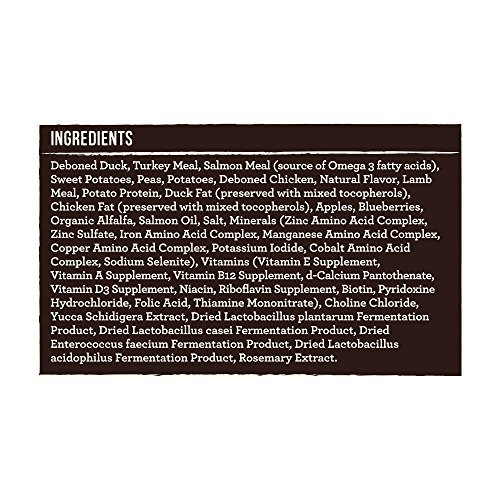原材料:骨抜きダック、ターキーミール、サーモンミール(オメガ-3 脂肪酸源)、スウィートポテト、エンドウ豆、ポテト、骨抜きチキン、ナチュラルフレーバー、ラムミール、ポテトタンパク、ダック脂肪(ミックストコフェロールで保存)、チキン脂肪(ミックストコフェロールで保存)、リンゴ、ブルーベリー、オーガニックアルファルファ、サーモンオイル、塩、ミネラル類(亜鉛アミノ酸、硫酸亜鉛、鉄アミノ酸、マンガンアミノ酸、銅アミノ酸、ヨウ化カリウム、コバルトアミノ酸、亜セレン酸ナトリウム)、ビタミン類(ビタミンE、ビタミンA、ビタミンB12、d-パントテン酸カルシウム、ビタミンD3、ナイアシン、リボフラビン、ビオチン、塩化ピリドキシン、葉酸、硝酸チアミン)、塩化コリン、ユッカシディジラスエキス、乾燥乳酸プランタラム菌発酵製品、乾燥乳酸カゼイ菌発酵製品、乾燥腸球フェシウム菌発酵製品、乾燥乳酸アシドフィルス菌発酵製品、ローズマリー