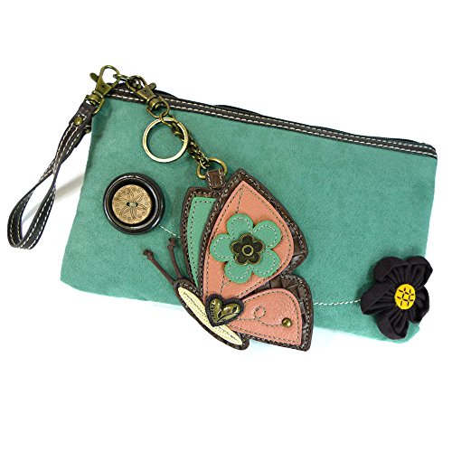 -. Feature : Synthetic suede clutch with butterfly coin purse/key fob / Patterned fabric lining and textured faux leather trim / Top zippered closure. / Clutch Dimensions: 4.5" X 0.5" X 5.5" / Fabricated flower applique and detailed wood buttons