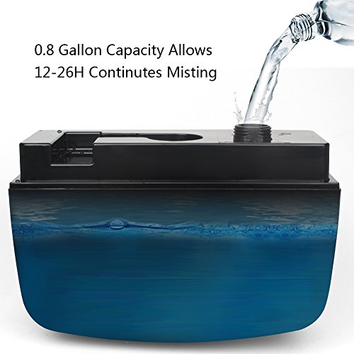 - 【3-LITER WATER TANK】: The twin nozzle produces mist independently and makes the uniform vaporization. Max. 300mL/H mist volume goes throughout the large space of up to 300-500 ft² faster and stronger. The tons of mist out while not leaving your table or floor wet.