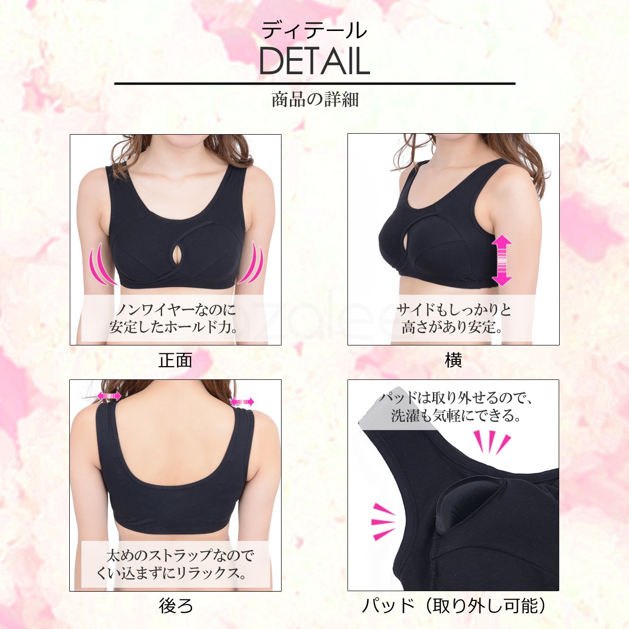 バストに触れる部分は取り外し可能なパッドが付く2重構造で、美しいバストラインをキープします。