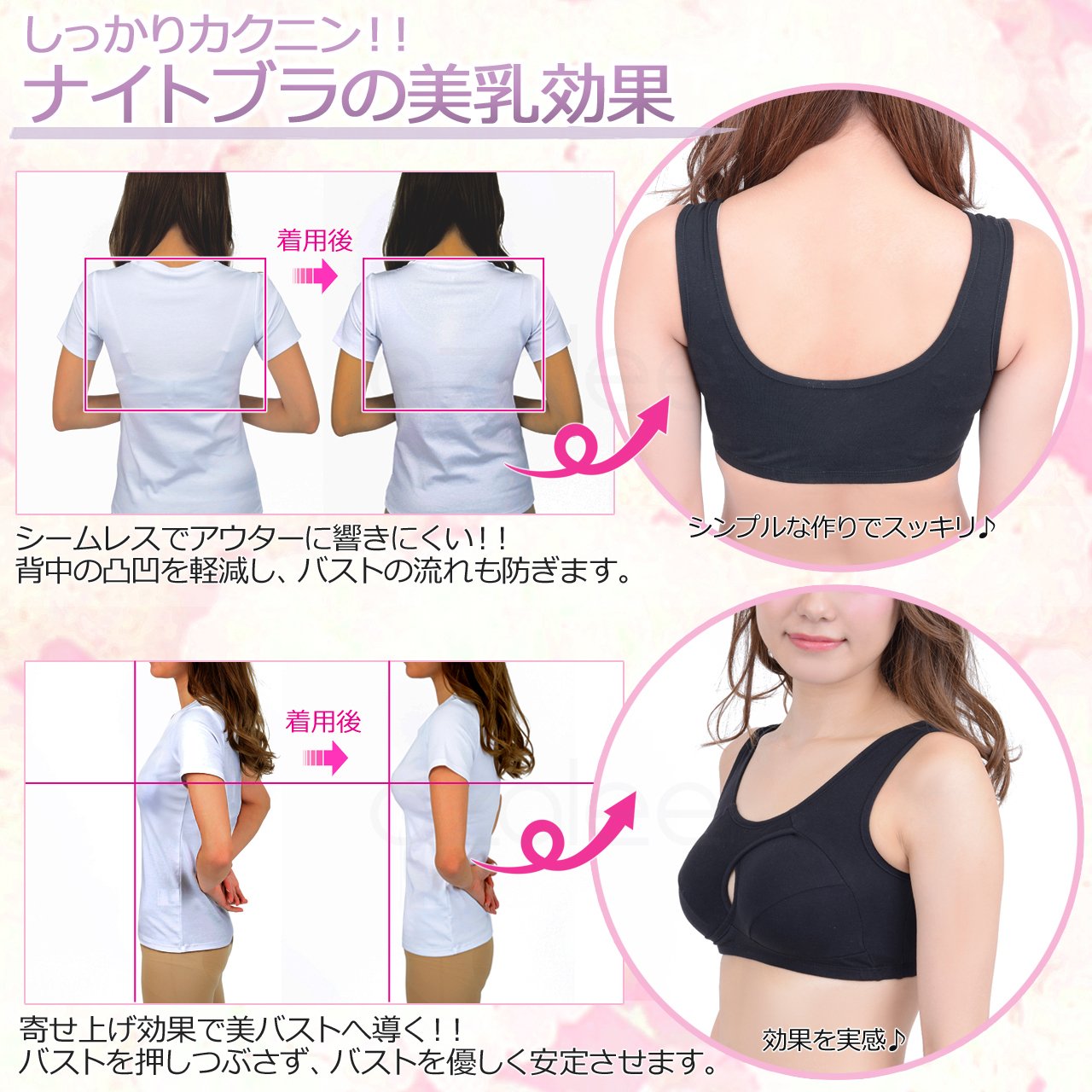 ノンワイヤーのナイトブラなので、睡眠中やスポーツ中でもバストをしっかりホールドし、バストトップを最適な位置にキープしてくれます。