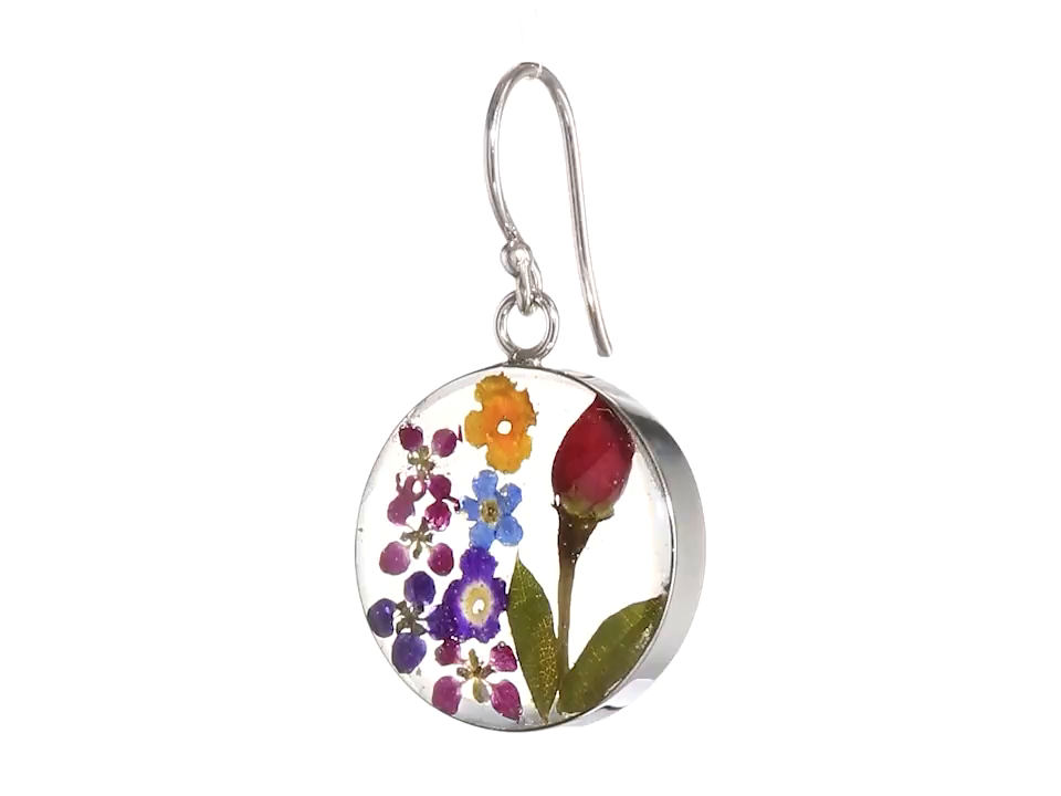 Unique circular translucent drop earrings featuring real dried flowers in colorful hues preserved in resin and surrounded by sterling silver settings