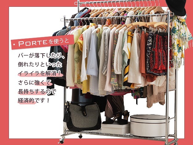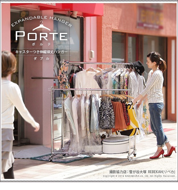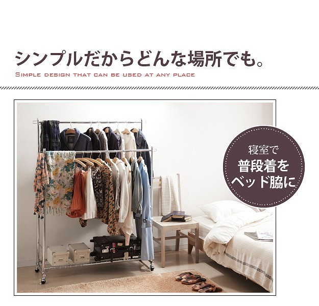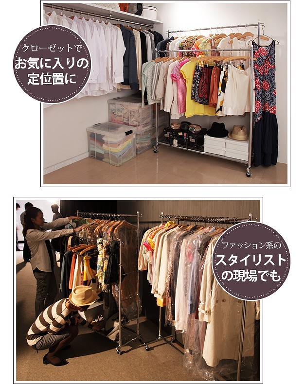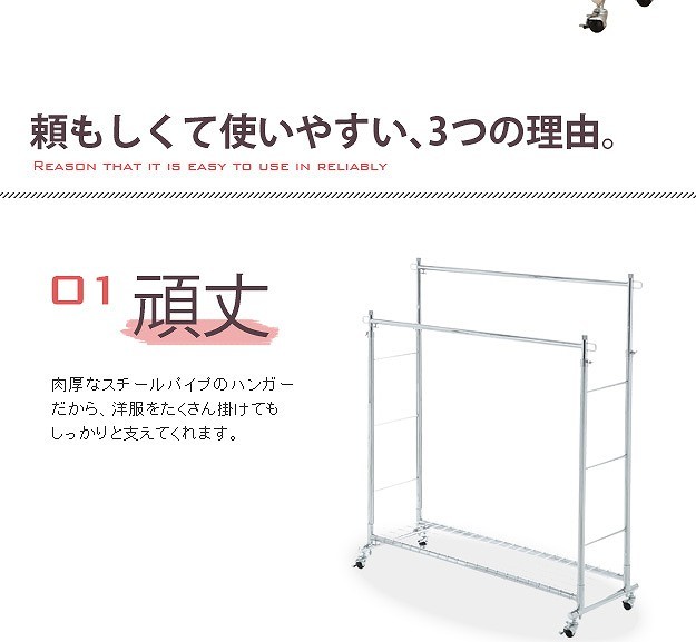 ●商品について:頑丈伸縮ハンガーダブル。幅も高さも伸縮するので、洋服の量やスペースにあわせてサイズ調節OK。厚みのある(1.2mm)スチールを使った頑丈なつくり。固定ネジなどの部品もスチール製なので、使っているうちに接合部分が緩みグラグラして壊れたりする心配もありません。ベアリング入りのキャスターは沢山掛けてもスムースに動くうえ耐久性にも優れています。