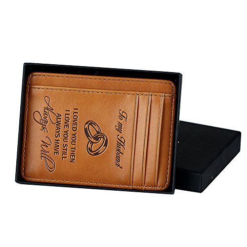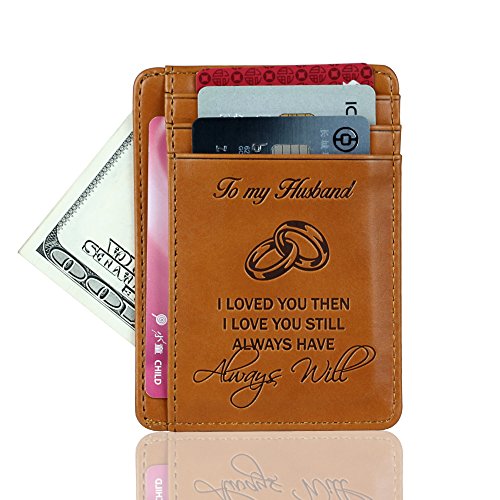 -. Feature : GIFT FOR HUSBAND: Brown color front pocket wallet with embossing that reads "To my husband - I love you then, I love you still, always have always will." The adorable gift yourself or your beloved man for birthday, valentine. / 100% GENUINE FAUX LEATHER: This super thin card sleeve is made of premium genuine faux leather that is durable, soft, and stylish. Top quality genuine faux leather wallet looks great and can be carried without bulk even in the front pocket / ADVANCED RFID BLOCKING: Our advanced RFID secure technology is engineered specifically to block 13.56 MHz in which our credit cards, debit cards, driver license and ID cards operate to protect the valuable information stored on RFID chips from unauthorized scans and Electronic Pickpocketing / SUPER MINIMALIST & SLIM: Extremely convenient to be carried around in your front or back pocket. This Minimalist Wallet has a compact and convenient design which is a good accessory for your daily life, travel, and business situation. / DURABLE CONSTRUCTION - Featuring premium brown genuine leather materials that are shaped and cut by the experts using the most traditional techniques. Show your ID through the transparent window. Buy to the days of men carrying only twofold wallets and women carrying only clutches!