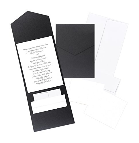 Studio : Hortense B. Hewitt Publisher : Hortense B. Hewitt Binding : Misc. Product Description Black shimmer pocket holds white invitation, adhesive glue dots included. 5.5" x 7.75". Includes white respond cards 4 7/8" x 3 1/2" and reception cards 4 7/2" x 4 1/4". White envelopes and respond envelopes are included. Includes 25 each black shimmer invitation pockets, 25 white invitations, 25 white invitation envelopes, 50 reception cards and 25 reception cards and envelopes. 25 count. Free printing templates available at GreatPapers website. 0