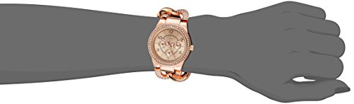 -. Feature : Rose-tone watch featuring Arabic numerals, luminescent baton hour markers and three subdials / Japanese-quartz movement with analog display / Mineral crystal dial window / Features genuine crystals on bezel and bracelet / Link bracelet with jewelry-clasp closure / Not water resistant