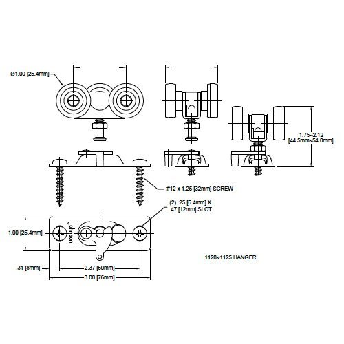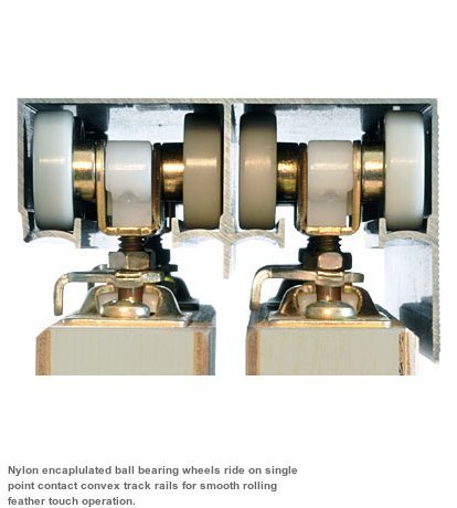 Precision extruded commercial grade aluminum track features Johnson's line-design fascia to hide finger marks and scratches or to hold paint if desired. Patented "tricycle" hangers with 1" [25mm] dia. wheels ride smoothly and quietly on convex shaped rails with single point contact. Hangers feature a quick disconnect clip system facilitating easy mounting or dismounting of door panels. Hangers are adjustable for height in case of settling.Feature