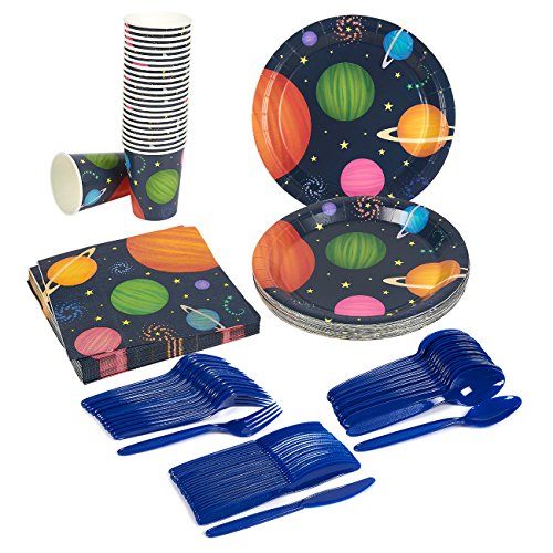 Studio : Blue Panda Publisher : Blue Panda Product Description Looking to throw a party or hold an event and want a one-stop simple solution for themed dinnerware? This Juvale Disposable Dinnerware Party Pack has all the dinnerware you need for 24 guests. Includes 24 of each of the following items: Plastic Knives, Spoons, Forks and Paper Plates, Napkins and Cups. Plates are thick and rigid and won't fold while carrying food. Napkins are soft and absorbent--a pleasure to use. Flatware set is 100% Food Grade and BPA-Free. Plates, Cups and Napkins are made of environmentally friendly biodegradable paper. Suitable for all occasions including parties, catering, outdoor events and simply just eating at home. Flatware is approximately 6 inches long. Paper cups hold approximately 9 oz of liquid. Napkins are 3-layer and measure 13 x 13 inches. Plates are approximately 9 inches in diameter. 0