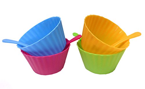 -. Feature : Set of colorful ice cream bowls in the quantity of your choice. / Colors include blue, hot pink, orange and green. / Each bowl comes with a matching spoon. / Each measures 2" high x 4" in diameter. / Perfect for a kid's party or ice cream social!