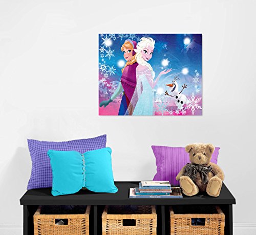 Hang the Disney Frozen LED Canvas Wall Art in your child's bedroom to display a colorful print of your child's favorite Disney Frozen princesses, Anna and Elsa. The LED Lights will light up your child's room to create a beautiful illusion on the artwork. The lights emit a soft glow that can also be used as a night light. Size: 15.75" W X 11.5" H.Feature