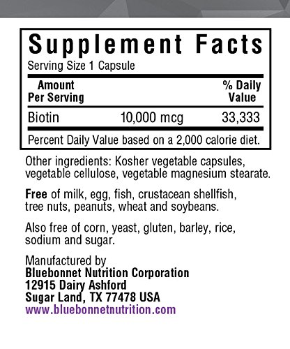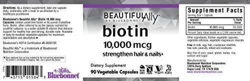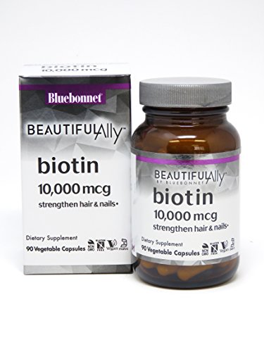 Bluebonnet's Beautiful AllyTM Biotin 10,000 mcg Capsules contain yeast-free biotin in its purest crystalline form. Biotin, often referred to as the beauty nutrient for youthful radiance, is a water-soluble B vitamin that delivers support for healthy hair and strong, durable nails. Available in easy-to-swallow vegetable capsules for maximum assimilation and absorption. ♦Feature
