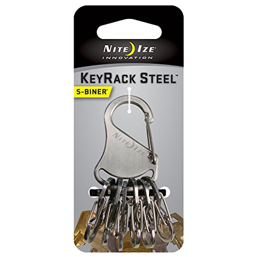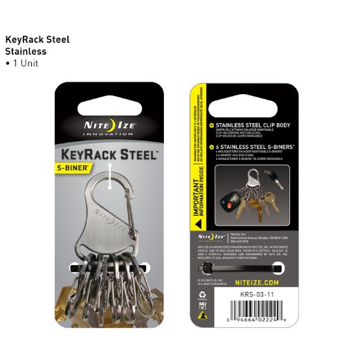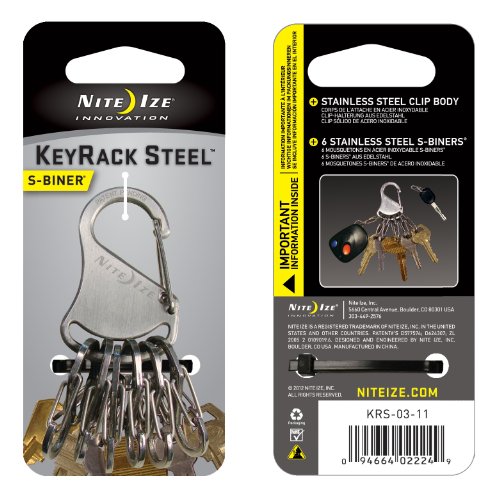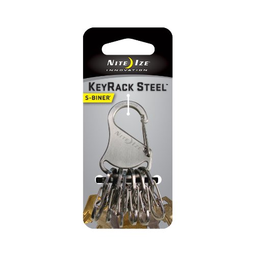 Studio : Nite Ize, Inc. Publisher : Nite Ize, Inc. Binding : Tools Home Improvement Product Description KeyRack Steel makes life a lot less complicated. Constructed of high quality stainless steel features a sturdy, secure carabiner gate closure allows you to clip your keys onto belt loops, zipper pulls, purse straps, anything with a loop or D-ring. The bottom half is a solid loop that holds six.5 sized Stainless Steel S-Biners that attach and release on either end to keep your keys securely,?conveniently organized. 0