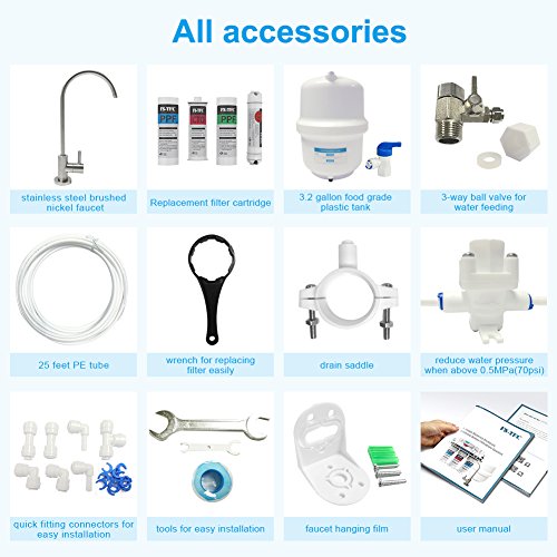 - Supreme Quality Material, System comes with Lead-Free(brushed nickel) faucet,3.2G storage tank, quick Connect fittings,provide safe, contamination-free pure water.