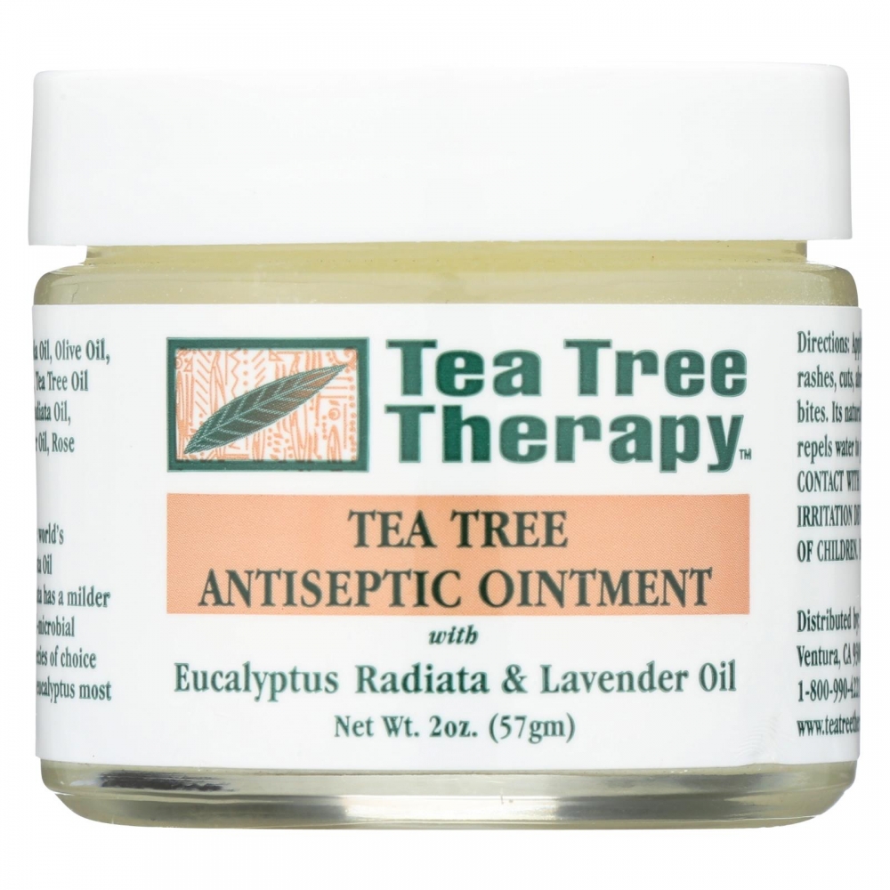 | Tea Tree Therapy Antiseptic Ointment Eucalyptus Australiana and Lavender Oil Description: Tea Tree Antiseptic Ointment With Eucalyptus Australiana and Lavender Oil Helps Relieve Minor Rashes, Cuts, Abrasions, Sunburn and Insect Bites Our eucalyptus oil is sourced from the world's largest eucalyptus plantation, Banalasta Oil Plantation. Banalasta Eucalyptus australiana has a milder, more pleasant aroma with strong anti-microbial qualities. Eucalyptus australiana is the species of choice for aromatherapists as the medicinal eucalyptus most suitable for use on the skin. Disclaimer These statements have not been evaluated by the FDA. These products are not intended to diagnose, treat, cure, or prevent any disease. Ingredients : Macadamia nut oil, canola oil, olive oil, cetostearyl alcohol (coconut and palm oil derived), melaleuca alternifolia, white beeswax, vitamin E, eucalyptus oil, lavender oil, and rose geranium oil. Size : 2 OZ Pack of : 1 Product Selling Unit : each |