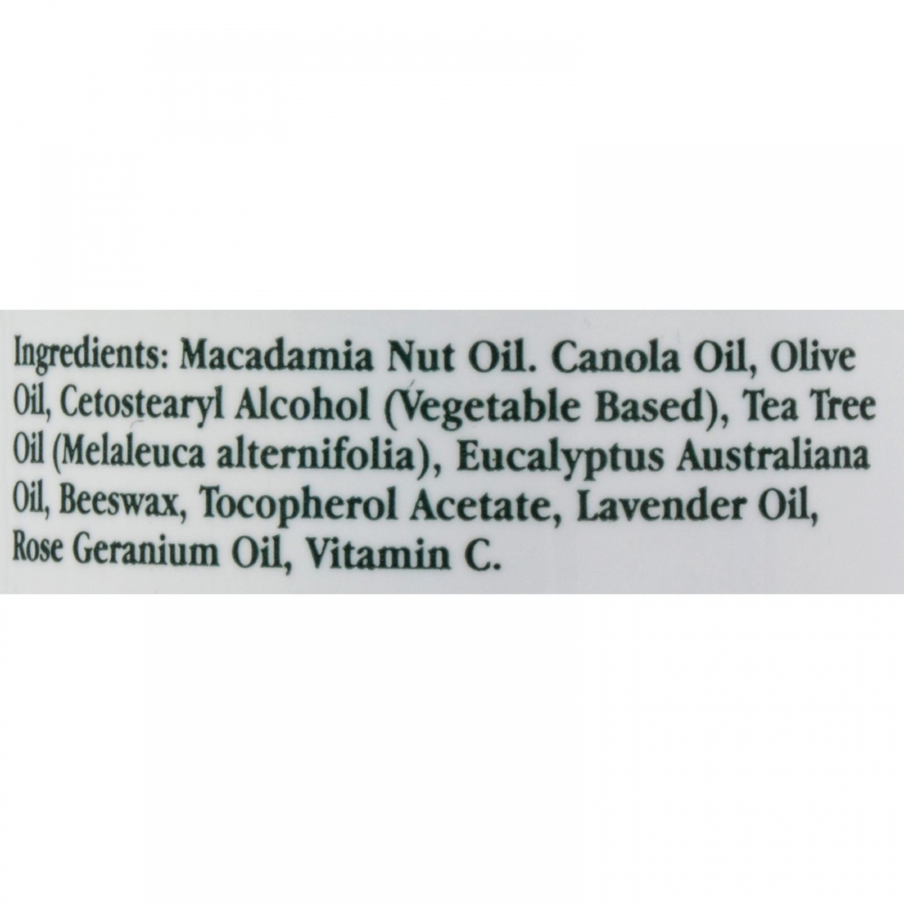 Macadamia nut oil, canola oil, olive oil, cetostearyl alcohol (vegetable based), tea tree oil (melaleuca alternifolia), eucalyptus australiana oil, beeswax, tocopherol acetate, lavender oil, rose germanium oil, vitamin C. |