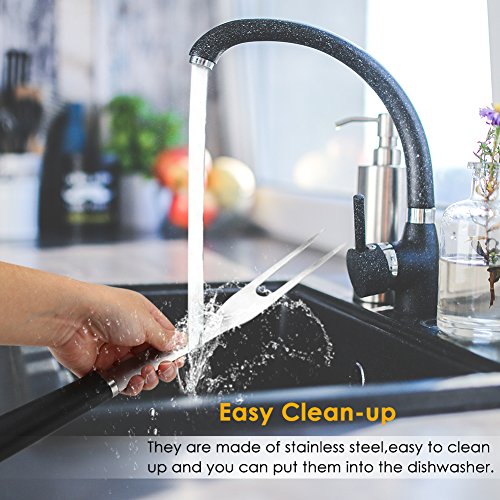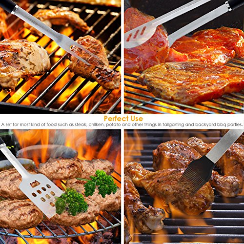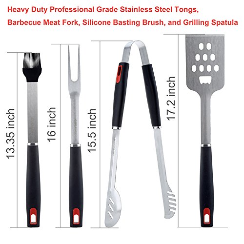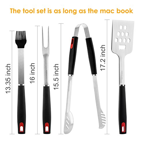 Features: Length: Tongs: 15.5' Grilling Spatula: 17' Silicone Basting Brush: 15.5' Barbecue Meat Fork: 16' Material: High quality stainless steel and PP plastic