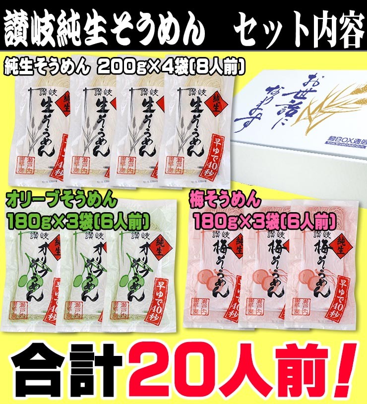 ■名  称3種の讃岐純生そうめん20人前■内容量【生そうめん】1袋200g×4袋(約8人前)【梅そうめん】1袋180g×3袋(約6人前)【オリーブそうめん】1袋180g×3袋(約6人前)※このセットはつゆが付いていません。■原材料名【プレーン】小麦粉、食塩、酒精、酸味料、加工でん粉【梅】小麦粉、食塩、酒精、酸味料、梅フレーバー、紅麹色素、梅パウダー、加工でん粉【オリーブ】小麦粉、食塩、酒精、酸味料、オリーブペイスト、クチナシ色素、加工でん粉■賞味期限 【生そうめん】約30日間【梅そうめん】約30日間【オリーブそうめん】約30日間※直射日光を避け、常温で保存してください。夏季冷暗所に保存してください。