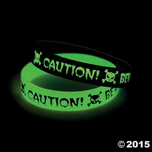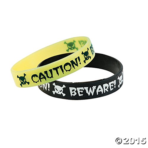 Make your trick-or-treat bags glow this Halloween! These Glow-in-the-Dark Halloween Bracelets are printed with, "Caution!" and, "Beware!" and feature a skull and crossbones designs for the perfect fright night accessory! Find even more rubber bracelets and fun Halloween jewelry on our website. 7 1/4" circFeature