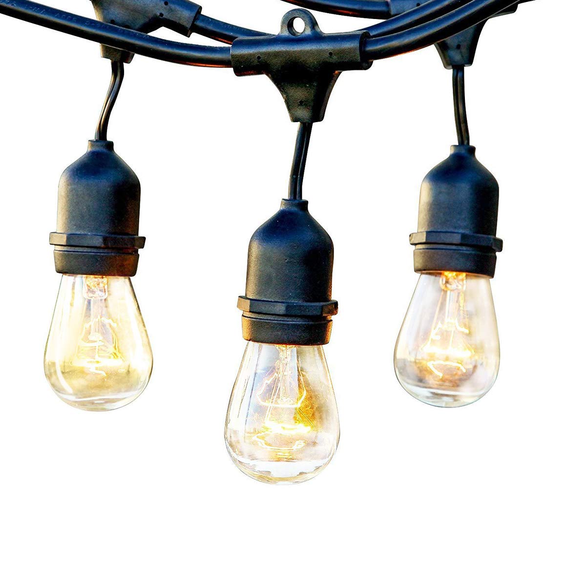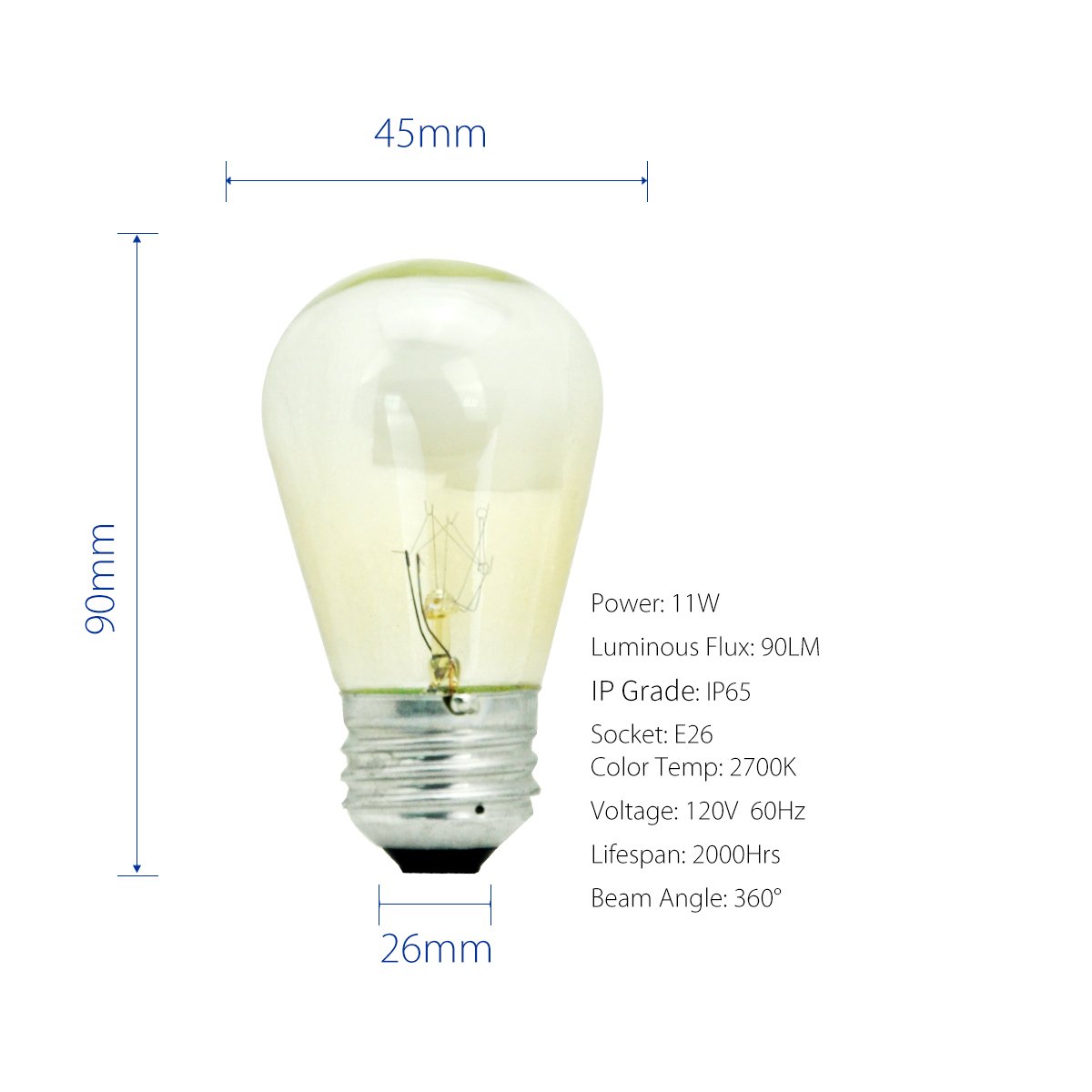 ☞コード長さ:約15m ソケット間隔:約0.91m 防水仕様:IP65 ソケット個数:15個 電球個数:18個(予備3個を含む) ソケットサイズ:E26 重量:約2.48kg 電源:AC120V 60Hz ビーム角:360º 電球消費電力:11w 電球全光束:90lm 色温度:2700k 電球材質:タングステン+ガラス 使用温度:-20℃~40℃