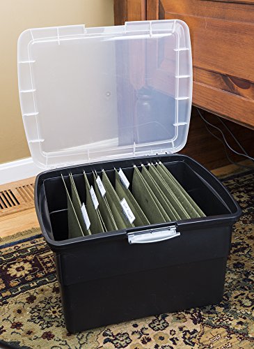 Whether you need to organize files for easy access or you want to store the old ones, this durable file box from United Solutions will handle both tasks. Can accommodate hanging files, letter and legal size documents. The streamlined design of the patented Snap and Lock lid, keeps your valuable documents safe and secure. Multiple file boxes stack nicely and slide effortlessly. Black file box with clear plastic lid. Item No.OF0046.