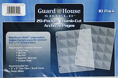 Product Description Guardhouse 20-Pocket "Thumb-Cut" Coin Pages are made from Archival Polypropylene that is 100% acid-free, oil-free and contains no PVC. Crystal Clear with Superior Strength. Recommended for 2" x 2" Coin Flips, Small Cards, and Photo Slides. Pack of 10-Pages. 0