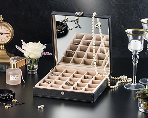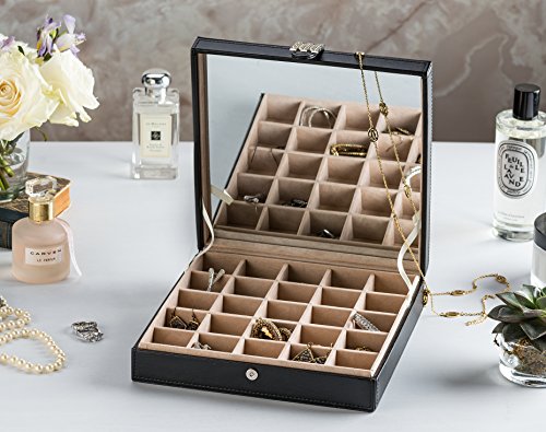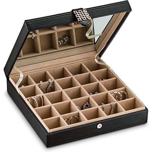 Glenor Co Earring Organizer - Classic 25 Section Jewelry Box / Case / Holder for Earrings, Rings, Necklaces, Jewelry, Cufflinks or Collections. 25 Small Compartments with Elegant Large Mirror - Black