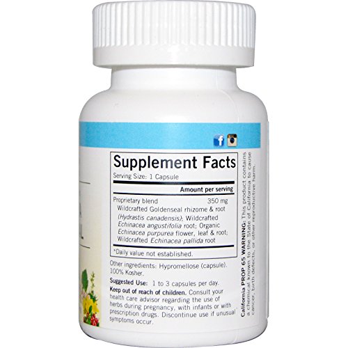 Suggested Use As a dietary supplement 1 to 3 capsules per day - Or as directed by your healthcare professional. Supplement FactsAmount Per Serving% Daily Value***Proprietary Blend350 mg*Wildcrafted Goldenseal rhizome root (Hydrastis canadensis), Wildcrafted Echinacea angustifolia root, Organic Echinacea purpurea flower, leaf root, Wildcrafted Echinacea pallida root *Daily Value Not Established California Prop 65 Warning This product contains a chemical know to the State of California to cause cancer, birth defects, or other reproductive harm. ***Percent Daily Values are based on a 2,000 calorie diet