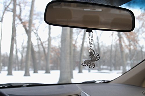 Silver Bling Butterfly Mirror Car Charm Hanger Ornament Clear Rhinestones with Chain