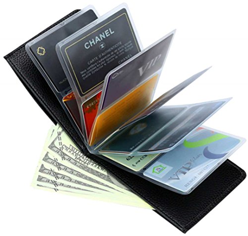 -. Feature : Size: 4 inch X 5 inch . Holds up to 24 cards / Lays cards out like a photo album / The soft, supple leather flexes so it's comfortable to sit on, even in the car / RFID blocking stops remote scanning of cards and protects P.R.Ivate information / Wallet holds up to 24 credit cards, you'll always have plenty of space to carry everything you want. Stop pulling, ting or fumbling to get that card out