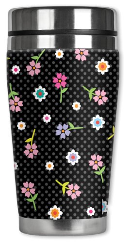 Mugzie Flowers & Polka Dots Travel Mug with Insulated Wetsuit Cover, 16 oz, Black