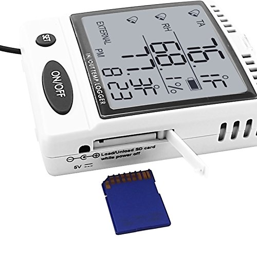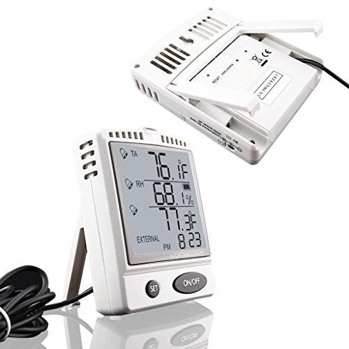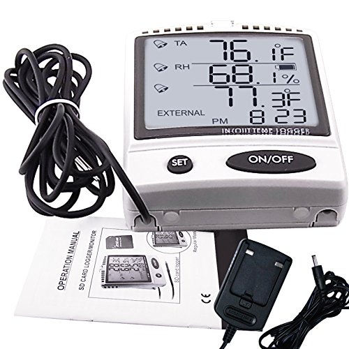 - Feature : Temperature Measurement: Range [0~50°C (Display: -10~70°C)] Resolution (0.1°C/°F) Accuracy [±1°C] / Humidity Measurement: Range [20~90%RH (Display:0%~99.9%RH)] Resolution (0.1%RH) Accuracy [±5%RH (at 25°C, 10~90%RH, others ±7%RH)] / Uses SD memory card data logging system for continuous recording and user-programmable sampling rate from 1min to 720min / Dual Temperature Sensor: built-in internal sensor & external sensor probe / Highly accurate microcomputer circuit / User-programmable high & low alarm thresholds for humidity & air temperature / Temperature unit: °C & °F (switchable) / Real time display in 24/12 hour format / Max/Min value since power on function for easy data review / Parts and Sensor are made in Switzerland / 3 Warning Indicators should the temperature exceeds the set limits:Audible beep (can be turned off), alarm icon on the LCD & bright red led indicator / Design with capacitance type RH sensor to get accurate and quick reading