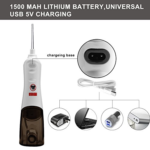 CONVENIENT AND PORTABLE: The Power and Modes control of this water flosser is separated, you can choose your mode first and turn on the device. Two minutes auto-timer to avoid it still working after you finish cleansing. 180 ML water tank with 2 replacement nozzles great for multiple users, rechargeable batteries can be used about 30 minutes with fully charge, it's ok to take it for travel.