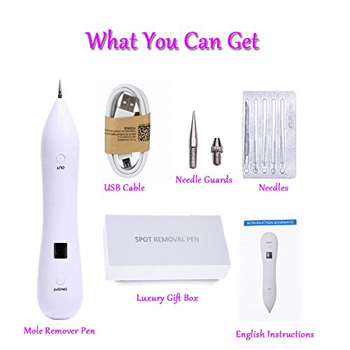 -. Feature : SAFE & EFFCTIVE MOLE REMOVAL PEN: Removal spot without burning the normal skin and blooding, high-tech and electric ion carbonation functions can instantly sweep freckles, age spot, flat moles and etc. / 3 DIFFERENT MODES: There are 3 different output powers, the lower level is used on spot and freckle, the stronger level is used on mole and skin tags. / HIGHGRADE MOLE PLASMA PEN: There is an exquisite package and practical spot removing effectiveness suit, the best gift for your relatives or friends. / LASTING FOR 3 HOURS: No charge required when working because of USB charging, easy operation suited for personal use or professional cosmetic treatment. / COME WITH GIFT BOX--1*Electric dot mole removal pen, 1*Charge cable, 1*Big Needles, 5*Small Needles; SATISFACTION GUARANTEE--We offer 1-year money back or replacement if you are not satisfied with this item.