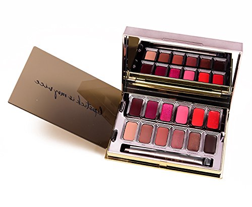 -. Feature : No matter what you're in the mood for, this limited-edition palette has it all. Experiment with 12 unique shades and ALL SIX finishes of Vice Lipstick in this one set. You'll never run out of options. Haven't tried Vice Lipstick yet? The pigment load is insane! Just one swipe provides a BIG laydown of color. Every shade applies smoothly (without dragging or skipping), hugs lips, and feels amazing. / Ideal for travel (it even includes a retractable lip brush), this super-sleek palette was made for experimentation. Been toying with trying a new shade but weren't ready to commit? With our Blackmail Vice Lipstick Palette, now you've got no excuse. Keep your options open without having to weigh down your makeup bag. Use the included brush to layer or mix shades; it's ideal for contouring or creating added depth and dimension. / Engineered with real life in mind, this palette makes it easy to apply on the go. We designed the wells with a special stair-step effect that's perfect for wiping any excess lipstick off the brush (and keeping the lipstick in its compartment, not all over the palette). / When you're done applying, flip the attached cover on top of the lipstick wells to keep the shades protected and the compact free of messes. As practical as this palette is, it's also beautiful-and guaranteed to elicit oohs and ahs when you pull this baby out of your makeup bag! The luxurious metallized gunmetal case has gold accents, just like our Vice Lipstick case. / Shades Included : Sheer Shame (Sheer) berry Firebird (Cream) deep fuchsia Big Bang (Metallized) bright pink sparkle Disobedient (Cream) medium pink EZ (Cream) bright red-orange 714 (Mega Matte) bright red Vanished (Sheer) pale neutral nude 1993 (Comfort Matte) medium brown Ex-Girlfriend (Sheer Shimmer) nude-rose w/pink shimmer Amulet (Metallized) metallic brick rose Conspiracy (Metallized) plum-bronze shimmer Blackmail (Comfort Matte) deep berry wine
