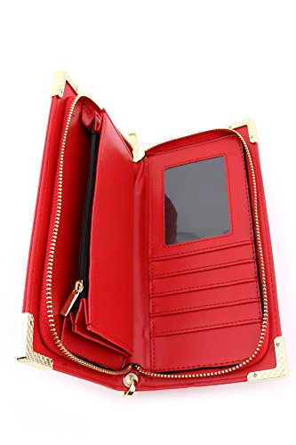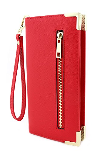 -. Feature : 4.5"(L) x 8.5"(H) x 1"(W) : It fits iphone 6 plus / Zipper closure & 8" detachable wrist strap / Faux saffiano leather & Gold tone hardware / Zipper pocket on the back / 1 ID window, 2 money slots, 5 card slots & 1 zipper coin pocket inside