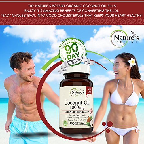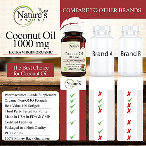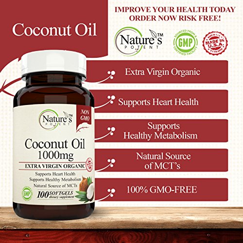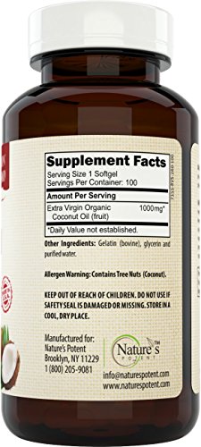 EXTRA VIRGIN, ORGANIC COCONUT OIL: Nature’s Potent Coconut Oil supplement provides you with the best, extra virgin coconut oil. 1000mg in one softgel.