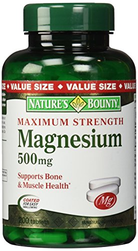 -. Binding : Health and Beauty -. Brand : Nature's Bounty -. EAN : 0074312530869 -. Feature : A component in over 200 enzymes in the body. / Supports bone and muscle health.* / Vital to the formation and release of energy from cells.* / These Vegetarian-friendly tablets are coated for easy swallowing. / *These statements have not been evaluated by the Food and Drug Administration. This product is not intended to diagnose, treat, cure or prevent any disease. -. IsAdultProduct : 0 -. Label : Natures Bounty -. Manufacturer : Natures Bounty -. MPN : US53086 -. NumberOfItems : 1 -. PackageQuantity : 1 -. PartNumber : US53086 -. ProductGroup : Health and Beauty -. ProductTypeName : HEALTH_PERSONAL_CARE -. PublicationDate : 2014-01-10 -. Publisher : Natures Bounty -. ReleaseDate : 2014-01-07 -. Studio : Natures Bounty -. Title : Natures Bounty Magnesium Tablets, 500mg, 200 Count -. UPC : 074312530869