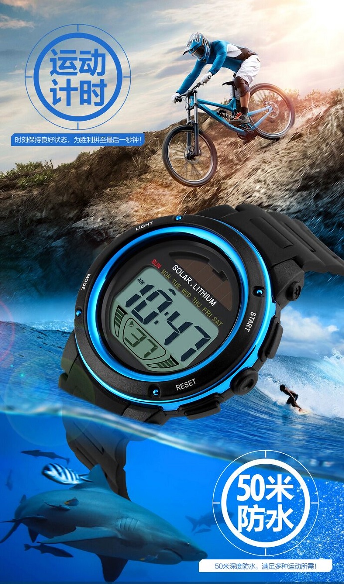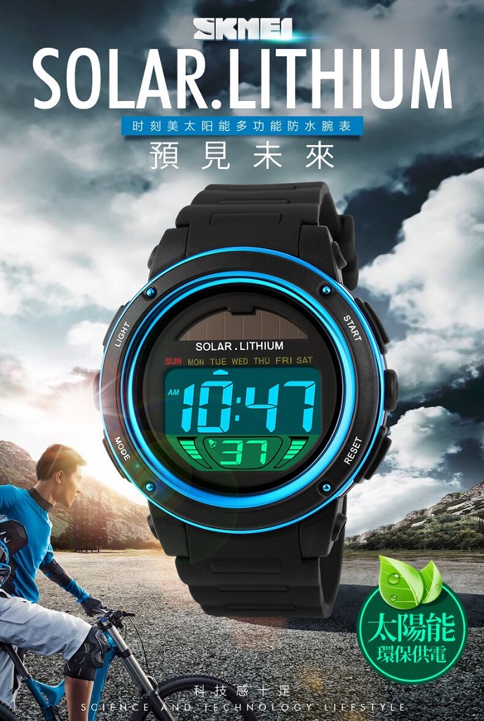 Jam tangan SKMEI memiliki solar panel yang berfungsi untuk mengisi baterai jam tangan saat terkena sinar matahari. Dengan fitur ini Anda tidak perlu lagi mengganti-ganti baterai jam tangan. Jam tangan dilengkapi dengan fitur seperti penunjuk tanggal, bulan, night light, waterproof hingga 50 meter dan stopwatch membuat jam tangan ini cocok digunakan untuk sebagai jam tangan sehari-hari. Strap jam tangan terbuat dari silicon yang kokoh dan ringan. Bagian belakang jam terbuat dari besi stainless steel sehingga tidak akan berkarat jika terkena keringat.