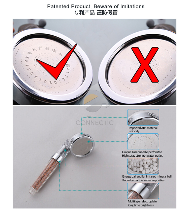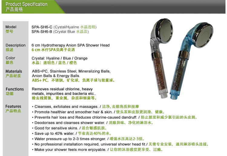 Tourmaline beads in the handle release negative ions promoting a fresh vibrant shower sensation softening water and helping reduce bacteria. Particularly gentle on children. SPA Negative Ion Shower Head so at a glance you can see how clean it is. 240 tiny micropores in the shower head reduce water consumption and nebulize the water. It's a cinch for owners of luxury and 5 start hotels and health spas to check cleanliness of shower heads. A version of this shower head is also available for hairdressers to help reduce chlorine in the water and leave hair shinning and soft.