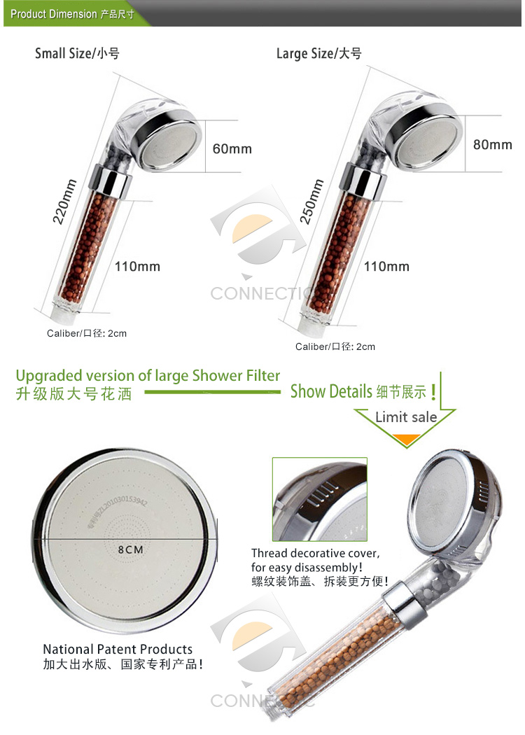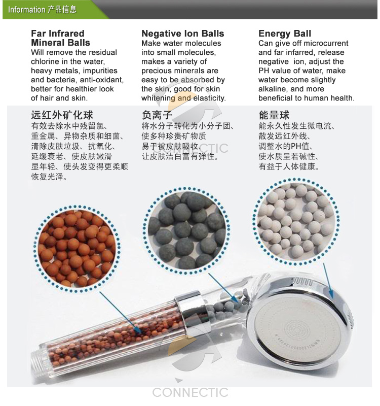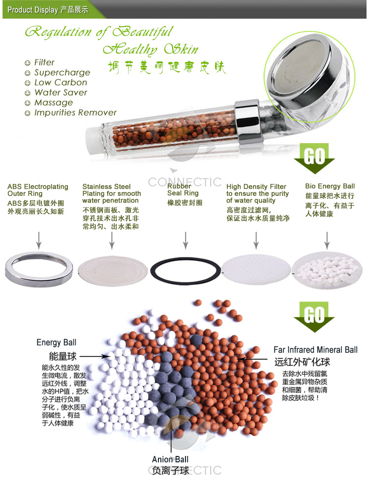 The NEW SPA Negative Ion Shower Head, ecological, lo-flo, shower head that aids water conservation and helps to improve health. Germanium beads in the handle reduce chlorine helping those with eczema and other skin conditions. Germanium is known to have an antibacterial effect. Softens and descales water, particularly good in hard water areas and helps to sharing the pores and moisturise the skin.