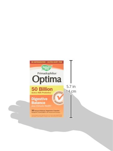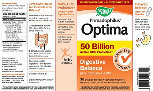 Primadophilus Optima Digestive Balance 50B 30 VegCapProduct Description 50 billion active probiotics including researched strains NCFM and Bl-04. Promotes healthy digestion - plus relieves occasional gas, bloating and constipation - 7 Probiotic Strains for Total Intestinal Balance - 50 billion active probiotics including researched strains NCFM and Bl-04 - 2 lactobacillus strains (26 billion CFU) for the small intestine - 5 bifidobacteria strains (24 billion CFU) for the large intestine/colon - Promotes healthy digestion - plus relieves occasional gas, bloating and constipation - Supports immunity Suggested Use As a dietary supplement take 1 capsule daily. May be taken at any time, with or without food - Or as directed by your healthcare professional. Supplement FactsAmount Per Serving% Daily Value***Primadophilus Optima 50 billion CFU proprietary blend331 mgLactobacilli HDS ProbioticsL. acidophilus HDS (La-14)L. acidophilus HDS (NCFM)Bifidobacteria HDS ProbioticsB. lactis HDS (Bl-04)B. lactis HDS (Bi-07)B. infantis HDS (Bi-26)B. lactis/bifidum HDS (Bb-02) Shelf Stable - No Refrigeration ***Percent Daily Values are based on a 2,000 calorie diet Other Ingredients: Microcrystalline cellulose, Plant-derived capsule (Hypromellose, Gellan gum), Magnesium stearate, Silicon dioxide Does Not Contain: Artificial coloring, Dairy products, Gluten, Preservatives Warnings: Keep out of reach of children. As with all dietary supplements, consult your healthcare professional before use. See product label for more information.Feature
