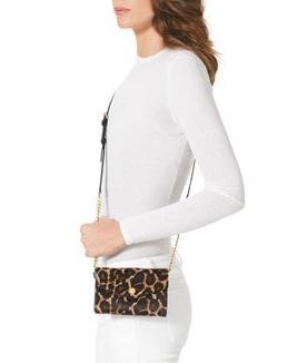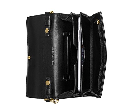 This classy phone cross-body bag features: black leather with haircalf detail; secure flap/snap closure. and gold tone hardware; interior pockets and credit card slots. Convenient slip pocket outside with adjustable shoulder strap 23-25" dropFeature