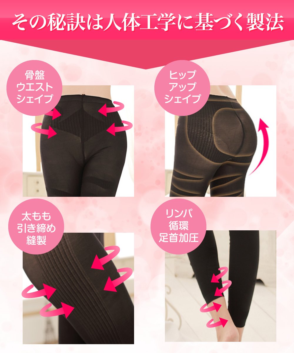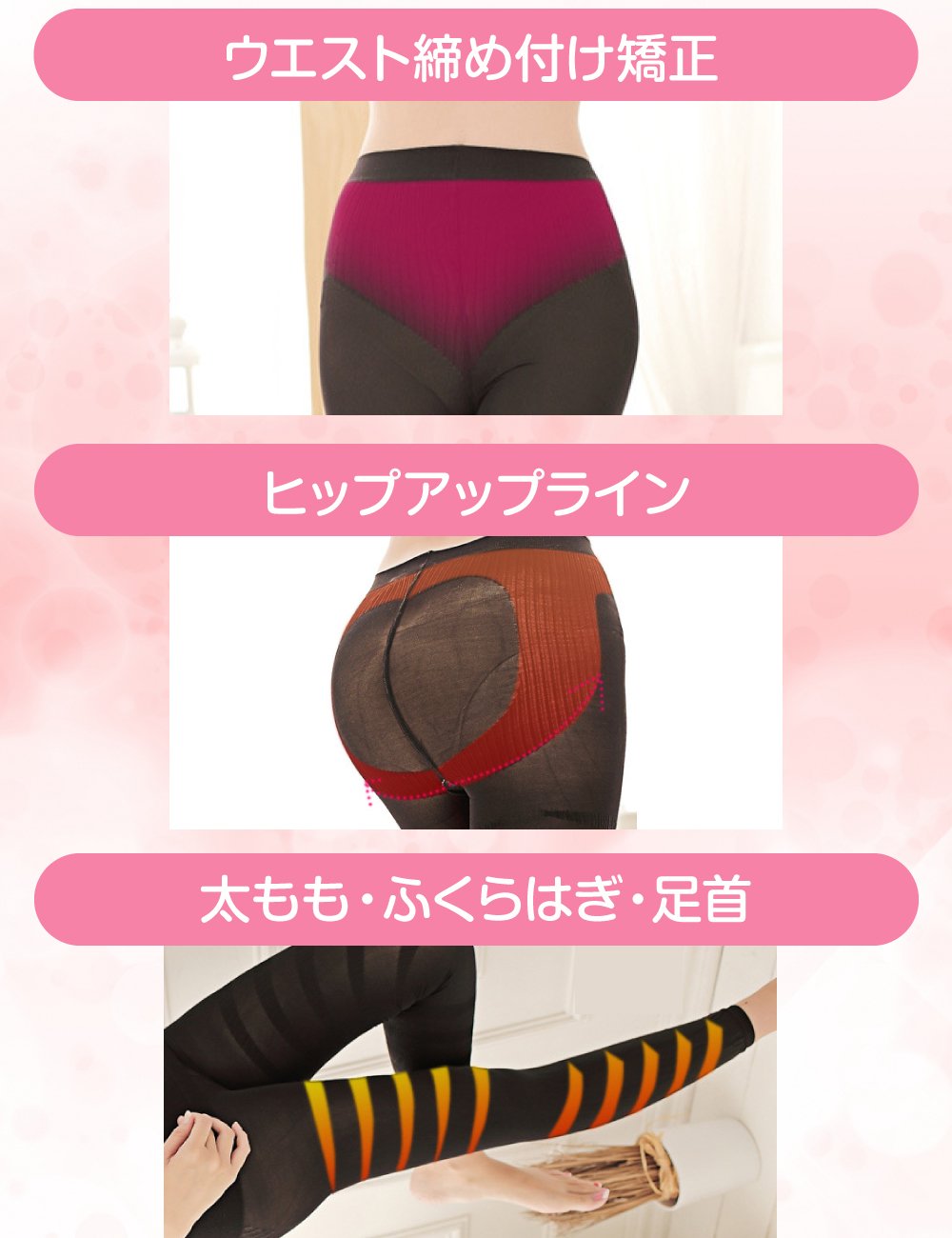 はくだけで脚をキュッとひきしめ軽くする着圧スパッツ寝るときに適した低めの着圧値で効果的にひきしめ、翌朝の脚をすっきり脚全体をじっくりケア。お休み中の熱を発散します。新素材により、着圧はそのままにやわらかな肌ざわりを実現しました。サイズ:M-L(ウエスト約64~77cm ヒップ約87~100cm) L-LL ウエスト約69~85cm ヒップ約92~105cm ナイロン93% ポリウレタン7%